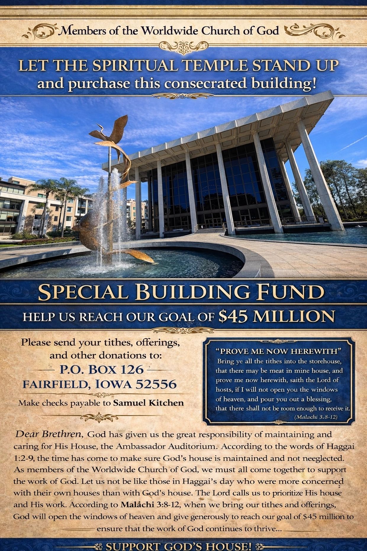 now this building was built by the generous donations of the membership of the Worldwide Church of God. I would like to bring it back to us.